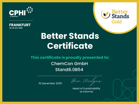 ChemCon is pleased to announce that its exhibition stand at CPHI Frankfurt 2025 has been awarded Gold level in the Better Stands Programme, the…