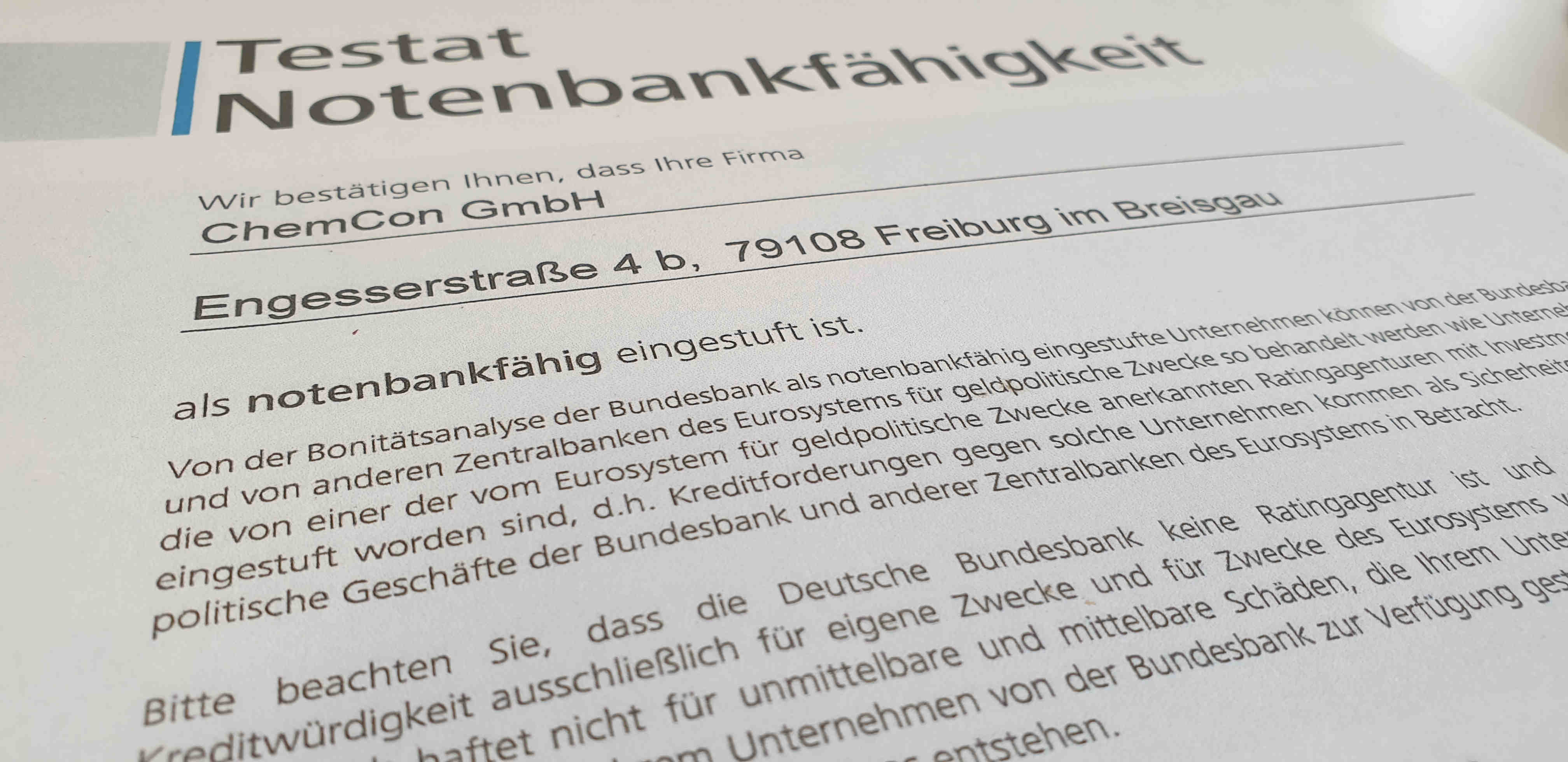 Like rating agencies that carry out such a rating, the Deutsche Bundesbank also carries out creditworthiness analysis procedures. The financial situation of the companies is analyzed in a two-stage assessment process (bonitaetsanalyse-kurzuebersicht-data.pdf) In April 2017, ChemCon GmbH was given the "Testat Notenbankfähigkeit" from the Deutsche Bundesbank. This attestation has now been renewed and ChemCon GmbH has confirmed that it has the status of "Testat Notenbankfähigkeit". With this, ChemCon GmbH shows its financially secure position and reliability, not only on a technical level.